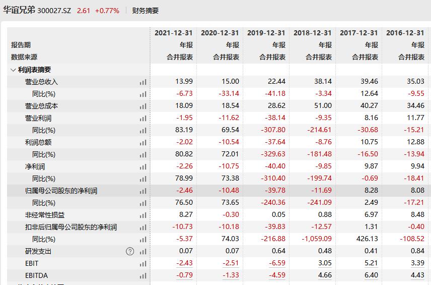 财报显示,2021年,华谊兄弟实现总营收13.99亿元,同比减少6.73%;净利润-2.46亿元,同比增长78.99%。