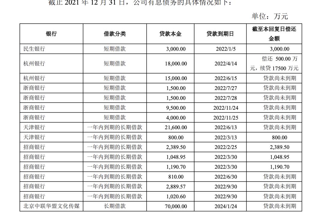 对此,华谊兄弟回复称,截至2022年5月20日,公司通过经营活动及资产处置产生的现金回流偿还有息负债累计8929.15万元,累计完成1.75亿元借款的续贷合约签署。借款的续贷工作正在积极沟通协商中,公司不存在无法偿还即将到期且难以续贷的借款。