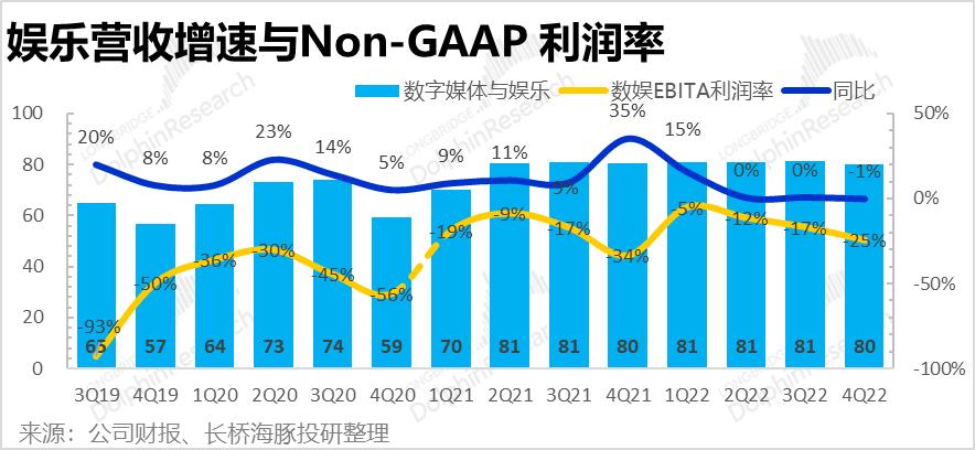 大文娱收入这个季度是80亿,已经是连续七个季度在80亿上精准横盘了。但这个季度的利润又有变差的趋势,后面当爱奇艺都在疯狂裁人的情况下,估计这块业务中的视频、电视盒子、UC应该都是优化的重灾区。