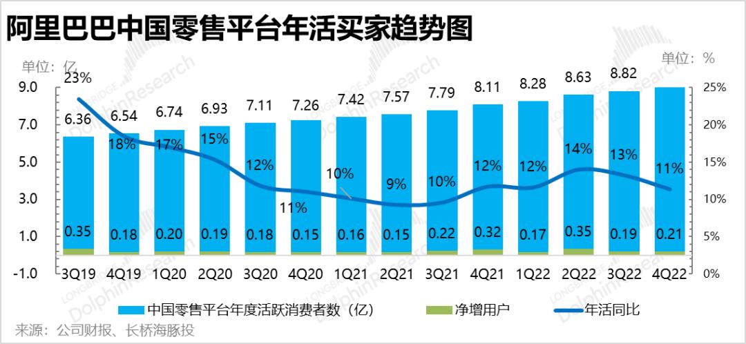 5. 用户数还挺不错:这个季度国内电商(含淘宝天猫、盒马/银泰、1688等)年活买家,整体达到了9.03亿,净增2100万,比上个季度还有提升,表现算是很不错;