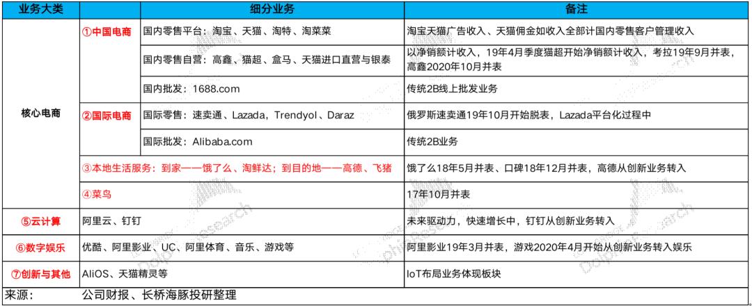 爱心提示:从12月的季度开始,阿里调整了财报的披露口径,海豚君把整阿里具体的业务分类再贴一遍,方便大家在看解读的时候,随时回溯。