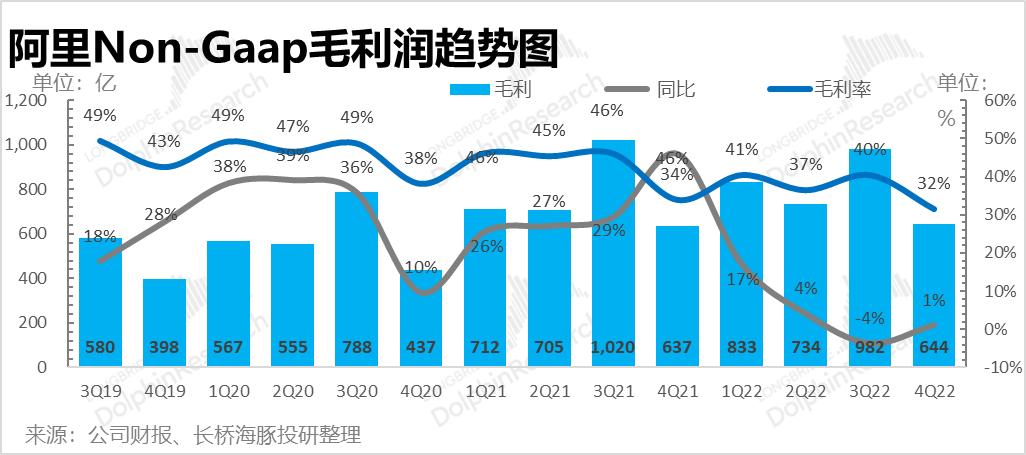 在成本与费用端上,阿里本季度剔除掉股权激励的Non-GAAP毛利644亿,终于小幅转正,毛利率32%,小幅超出了市场预期。