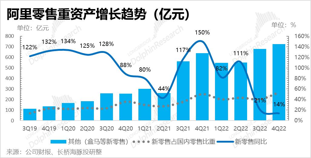 国内重资产零售业务主要包括盒马、高鑫零售、银泰、猫超自营、天猫国际自营与考拉。这个季度重资产零售业务收入725亿,高鑫并表基数期已过,同比增速进一步回落到14%。