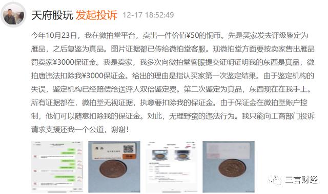 有卖家投诉称,在微拍堂上售出一枚价值50元的铜币。后经买家鉴定为赝品,但是复鉴为真品。然而,微拍堂方面却以其售假为由扣除3000元保证金,理由是只认鉴定机构的第一次结果。而实际上第一次鉴定为假系该机构失误导致,且鉴定机构已经赔偿给送评人双倍鉴定费。但即使如此,微拍堂仍然强行扣除这名卖家3000元保证金。