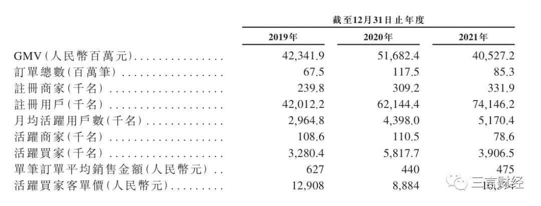 招股书披露,2019年、2020年、2021年微拍堂GMV分别为423.4亿元、516.8亿元和405.3亿元;活跃买家客单价分别为12908元、8884元和10374元。