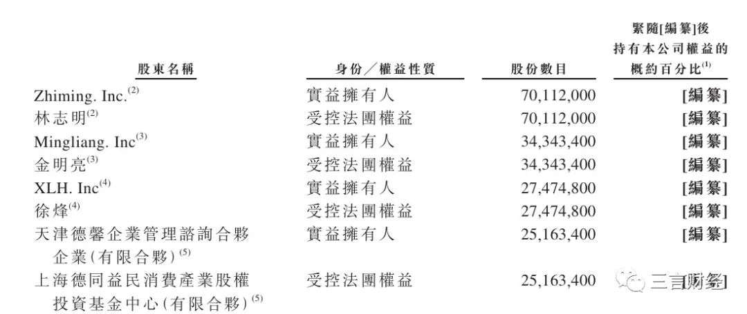 公司主要股东为林志明 、金明亮、徐烽以及天津德馨企业管理咨询合伙企业和上海德同益民消费产业股权投资基金中心(有限合伙)等。
