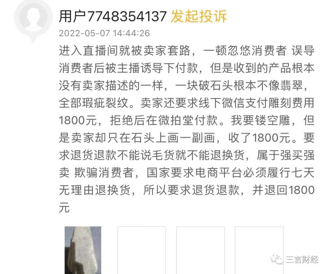 有网友投诉,在微拍堂平台,一进入直播间就被卖家套路,一顿忽悠误导后,被主播诱导下单付款。然而,收到的产品和卖家描述的根本不一样,“一块破石头根本不像翡翠,全部瑕疵裂纹”。这名网友称想买镂空雕,但实际却只是在石头上画了一副画,收了1800元。