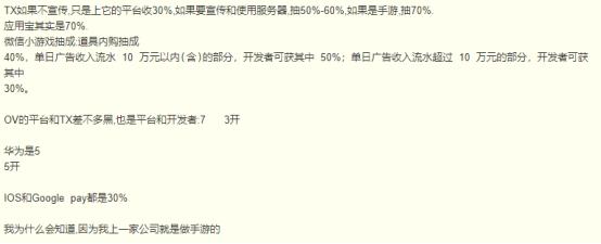 “不宣传只上腾讯应用宝平台收 30% 、宣传和使用服务器则抽 50% ~ 60% 、如果是手游,应用宝抽成 70% 左右。”