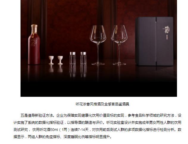 2020年12月,宜宾听花酒业与四川轻化工大学白酒学院,开展针对男性人群饮用后血清免疫指标、血清素、激素水平、深度睡眠比例等生理指标测试研究。