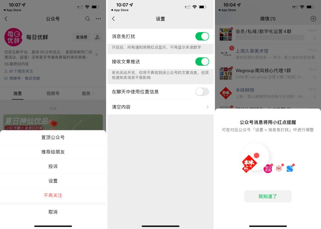 后续新关注其它服务号,则直接默认「消息免打扰」模式开启;若需要接收某个服务号消息,再进行单独开启即可,其它服务号则不受影响。
