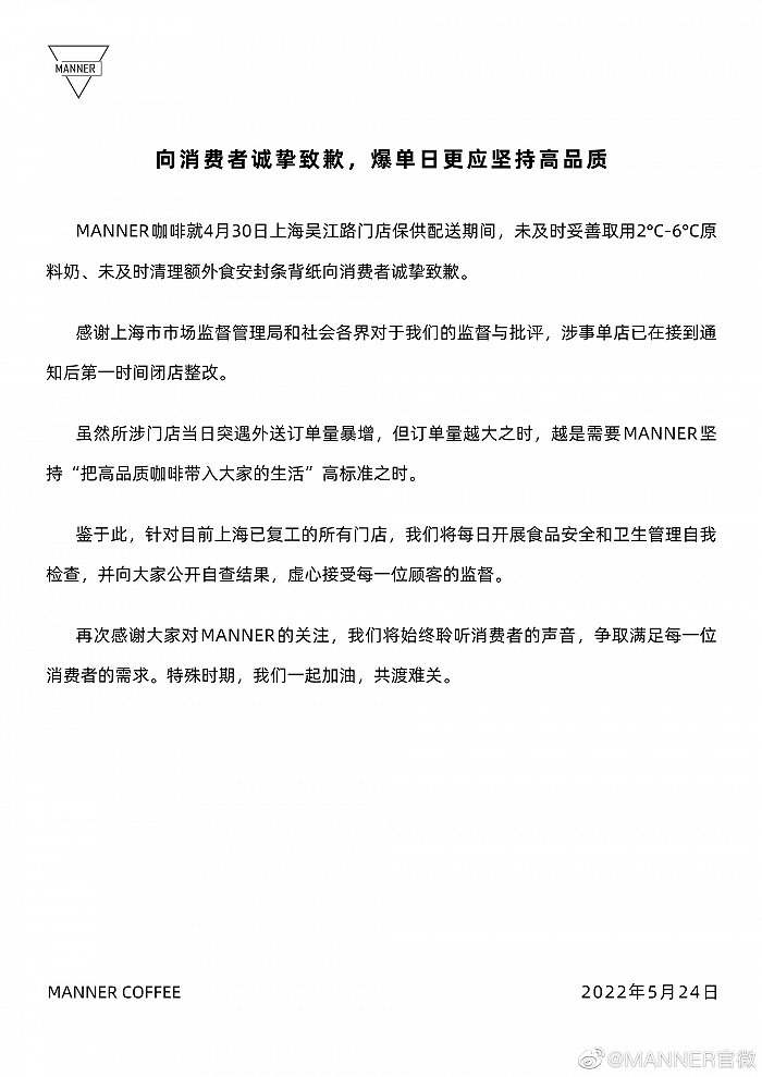 MANNER COFFEE在其官微致歉。
