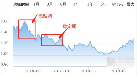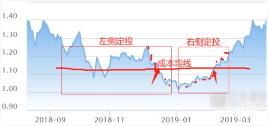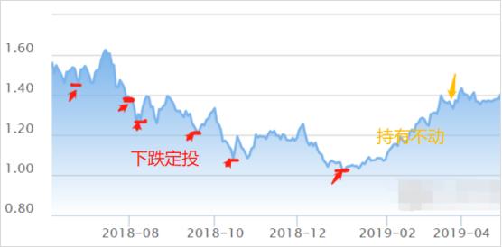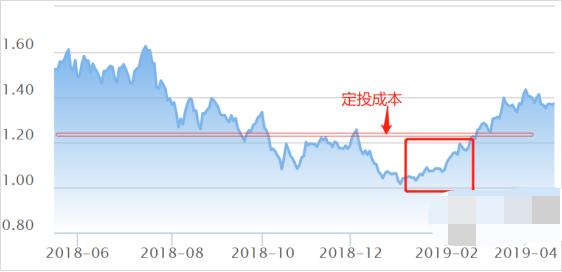 4%定投法是“买跌不买涨”,从18年6月高位基金净值为1.46元,每次跌破新低4%后就买一笔,直到底部净值为1.016元结束购买,然后一直持有等待上涨。期间平均定投成本为1.26元。也就是下图横线位置: