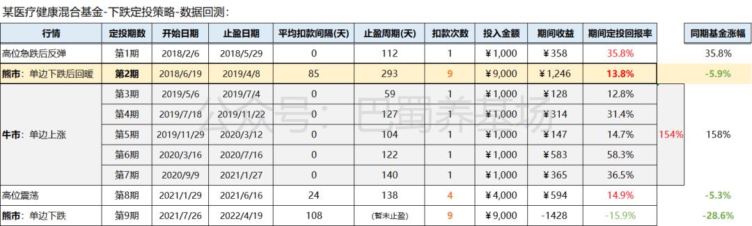我首先关注到的还是“第2期”,2018年6月~2019年4月期间,先跌后涨的微笑曲线行情下,该基金本身期间涨幅-5.9%,而该定投策略的收益率是13.8%!