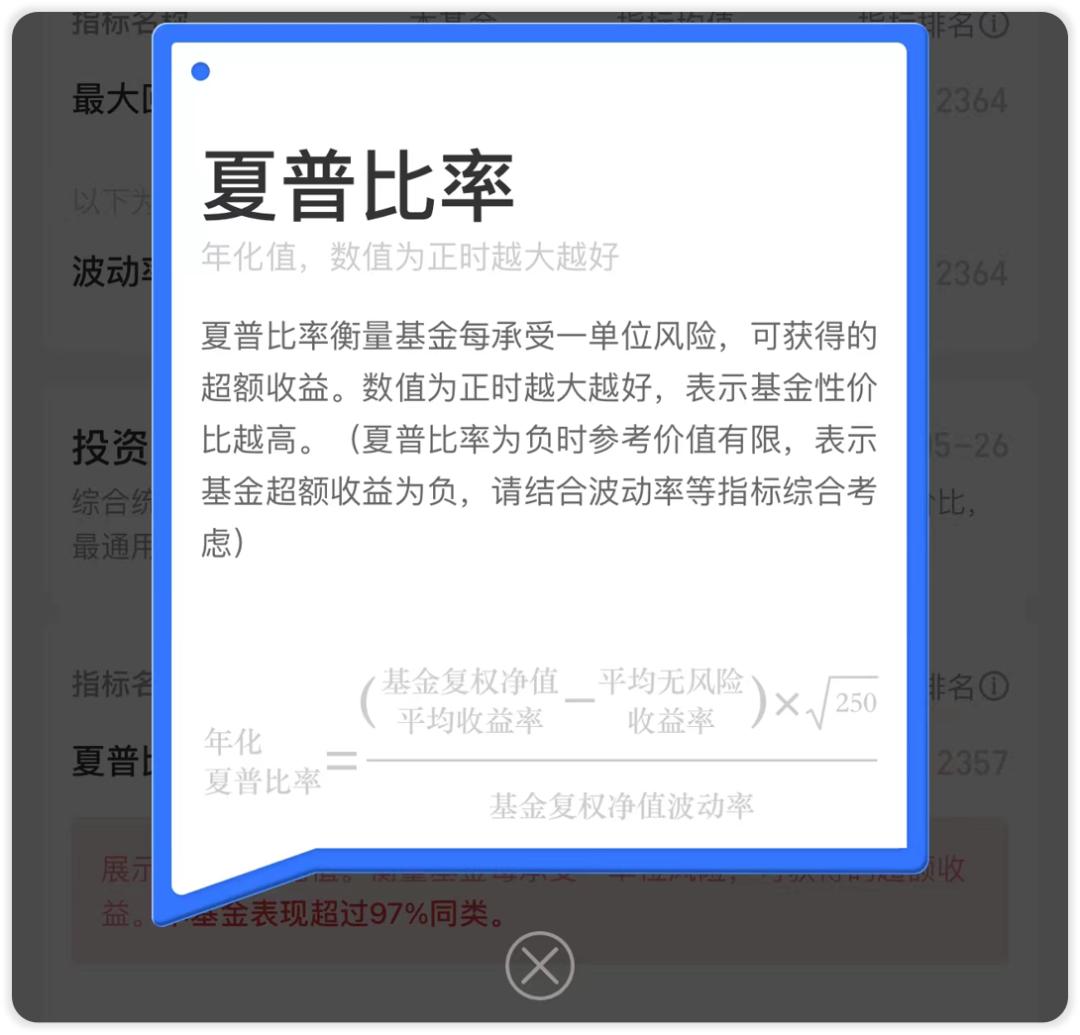 这里不得不夸一下蚂蚁,把基金分析指标做了分类之余,点击指标旁边的(Σ)也可以看到指标具体的定义——