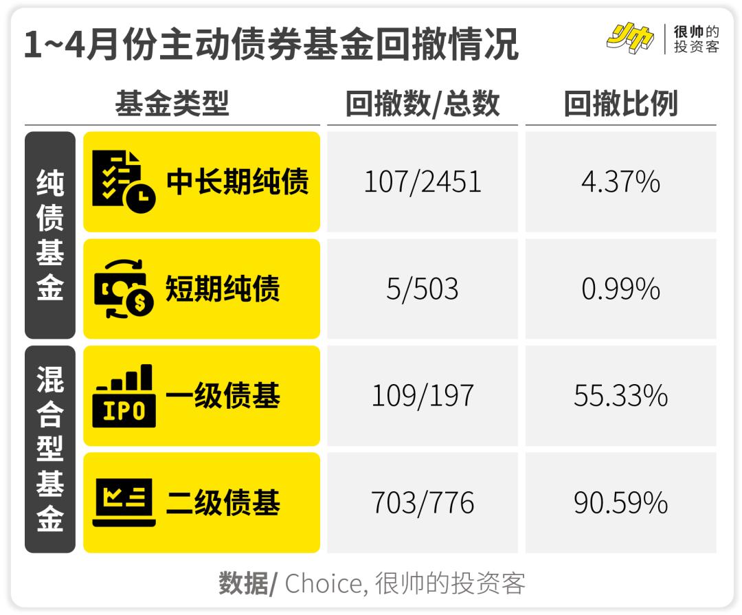根据Choice的数据,从年初到4月底,全部主动型的债基中,有924只是下跌的,占比达到23.5%。