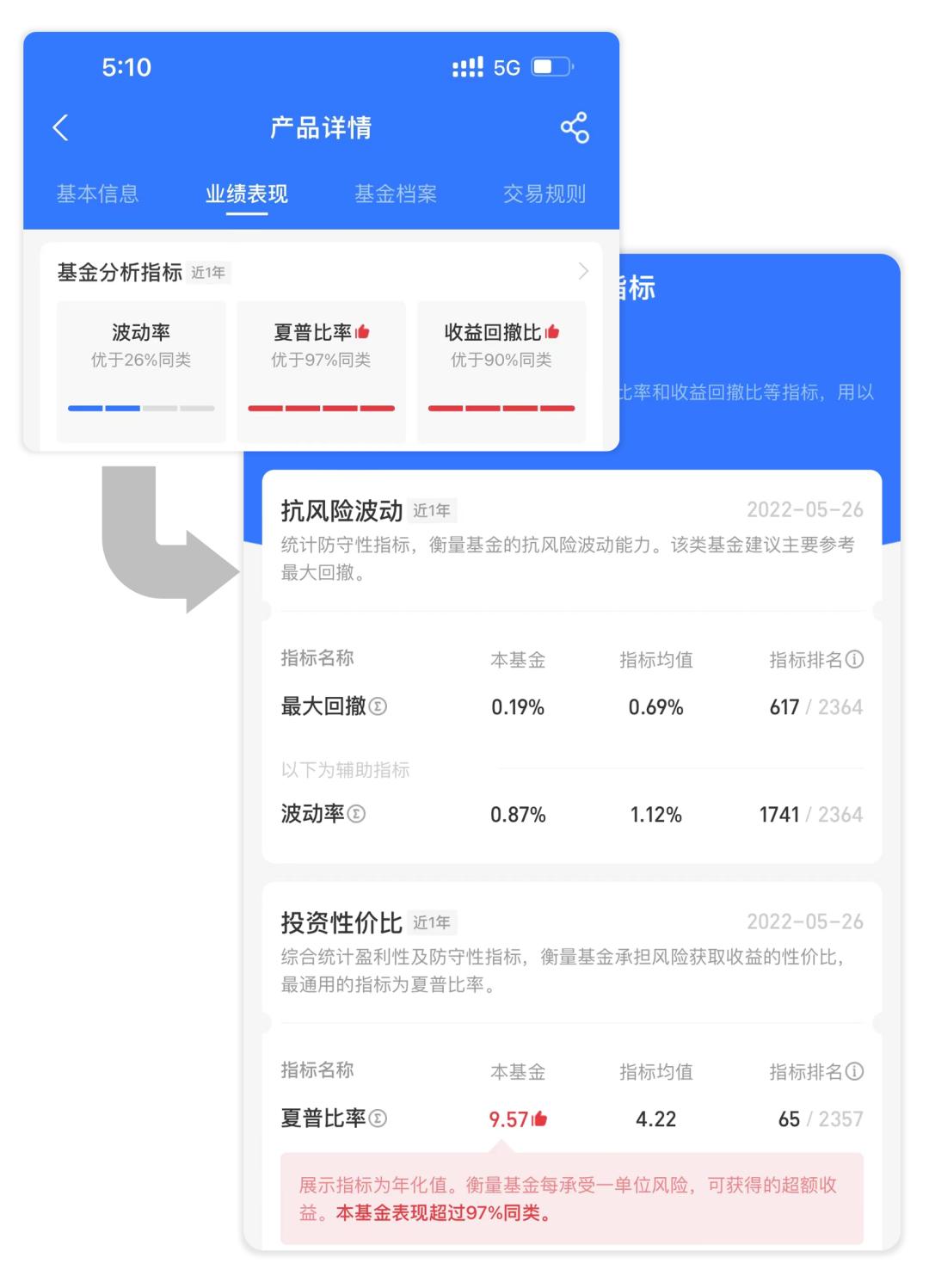 还是以蚂蚁财富为例,点进去基金页面后,我们可以看到它的夏普比率情况,点进去也有具体的数值和指标排名。