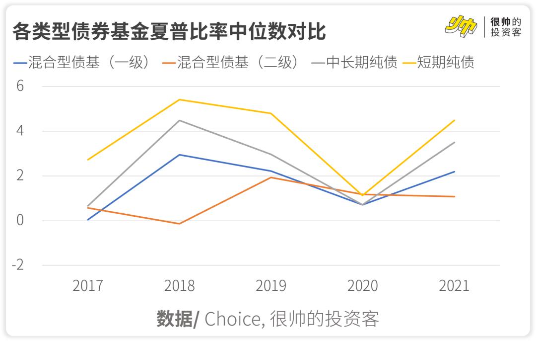 另外,我拉了下过去几年、各类基金的夏普比率(Sharpe Ratio)的中位数——