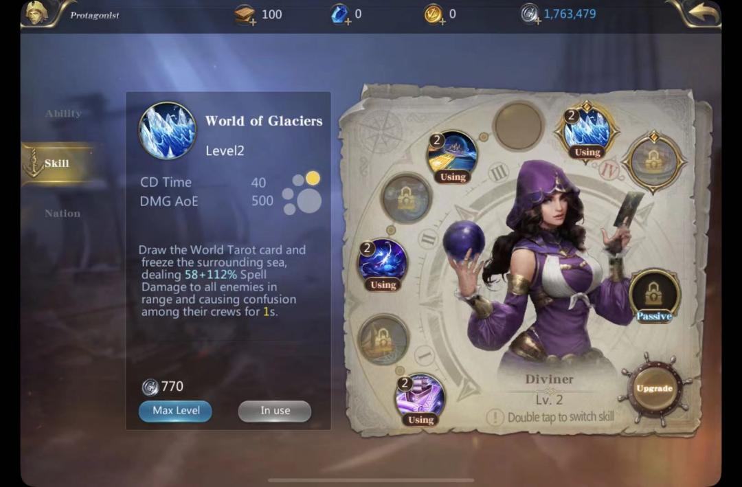 而到了海上遭遇战的战斗界面,船只可以像很多RPG角色那样放技能。船只加速、火炮开火一类的技能倒是没什么好说的。但是当你看到诸如冰冻海面、召唤闪电的时候,还是很难绷得住的……