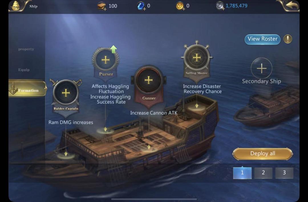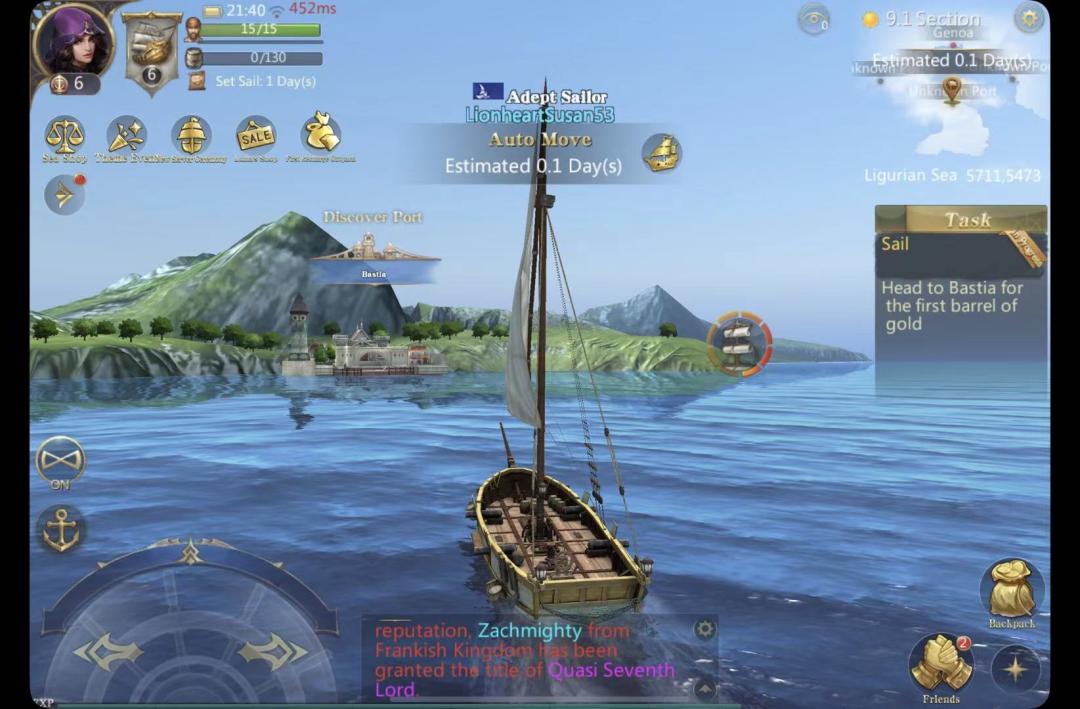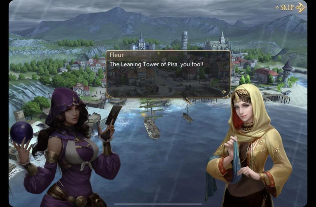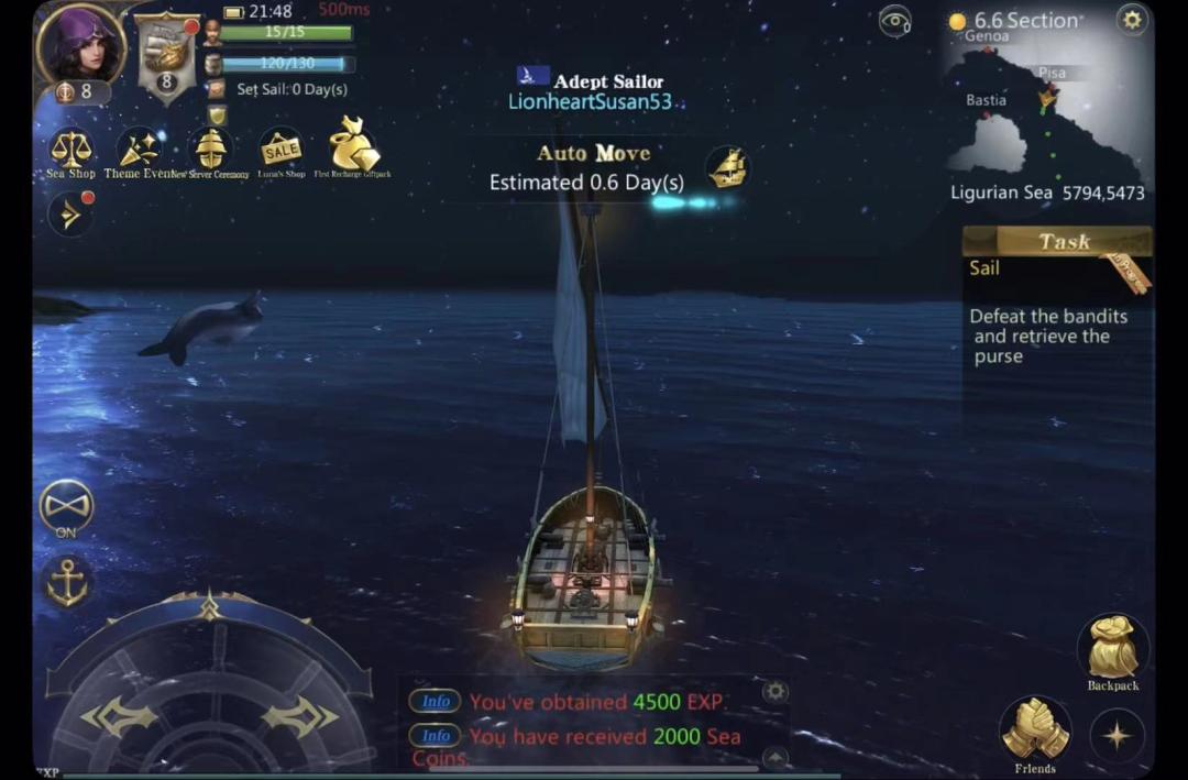 流程上,有时候到达一个新的港口,解锁一个新的地标,相应的运镜能展现出这座城市的风貌。夜间航行的时候,海豚从月光照耀的海面上跃出——尽管建模不够精细,但这些场景都塑造得不错,异域冒险的味道渲染到位了,可是下一秒,技能升级的红点、加速航行的引导蹦出来很快就会破坏气氛。