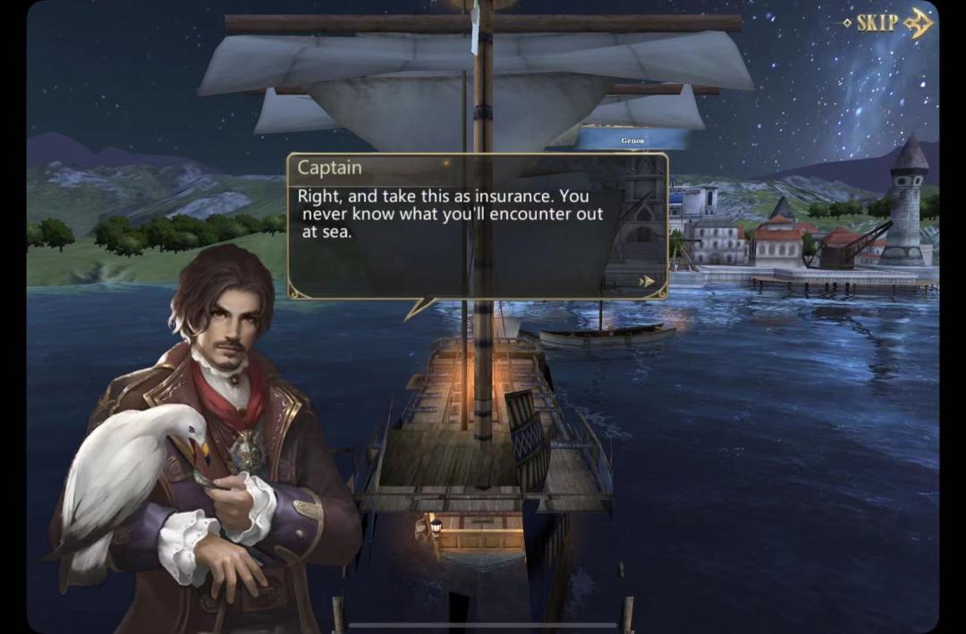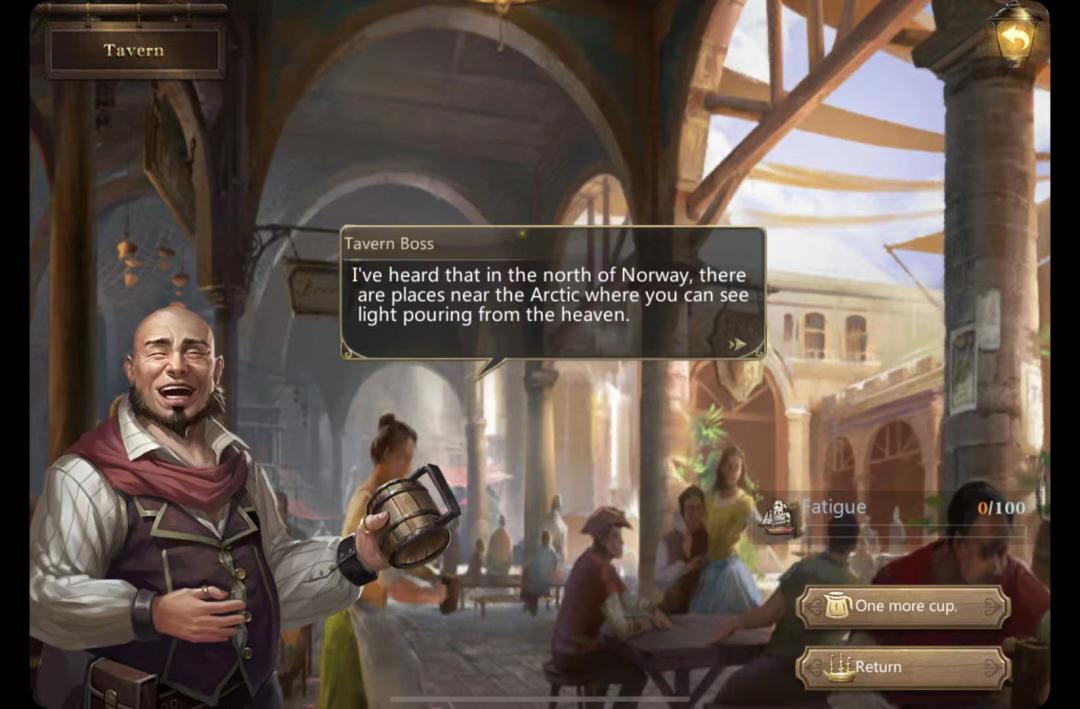 游戏确实满足了我对“在手机上玩到一款海盗题材RPG”的想象。这边跟着主线推进剧情,认识了一些重要的角色,接到了某项委托,打算出海去冒险。流程上没有跳出强引导的时候,可以去按照实时的价格买卖货物,也可以在酒馆里请NPC喝酒获得一些情报——就像你对一款海盗题材的单机游戏会有的那些期待一样,但是一转眼,出海遭遇敌人的时候,进入战斗场景就又变成了上面说的那样,非常跳脱。