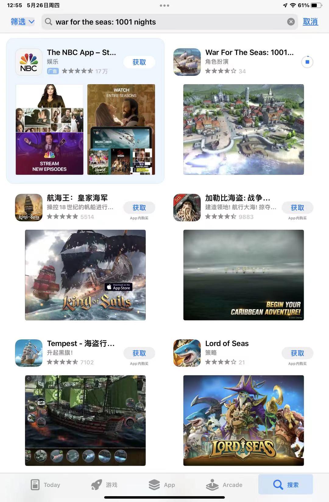 比如在App Store里搜游戏名字,出来的一些同类游戏屈指可数。其中也不乏《加勒比海盗》正版IP授权的产品。但从其他产品的玩法简介来看,在移动平台上,大家对这一题材的玩法设计方向也都还在探索。