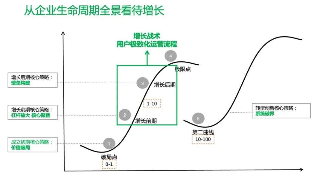 所以,要在增长高速的发展期去提前布局第二曲线式的创新,也就是第五个点,以实现从10到100的过程。