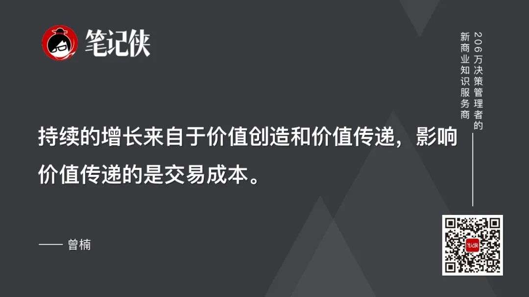 但可以看到,持续的增长来自于价值创造和价值传递,影响价值传递的是交易成本。