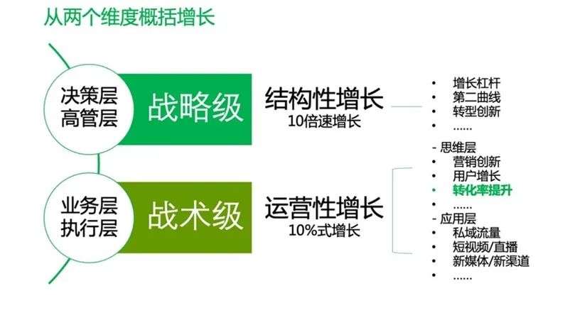 方向正确了,业务层、即执行层需要在运营性增长上多努力,以实现10%式增长,这就是我们战术级增长,还可以切分成思维层和应用层。