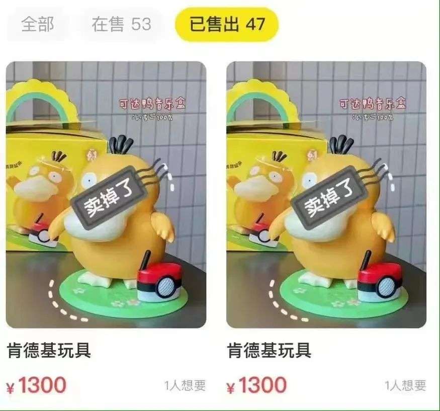 肯德基儿童套餐赠品可达鸭一夜之间火遍全网,二手网站价格“水涨船高”,代吃卷土重来。常规操作“IP玩具+套餐”如何再创新高?除了黄牛的推动 ,宝可梦、肯德基、李佳琦三重流量加持也是鸭鸭爆火的原因之一。最重要的,本次鸭鸭再创表情包适配度新高,非常适合二创与网络传播,甚至已经出现基于可达鸭音乐盒二创的生意。消费社会培养出幼稚主义的风气,滋养出更容易产生不必要消费的儿童化消费者。肯德基在深谙营销之道的同时顺应这一风气,也是本次可达鸭爆火的原因。