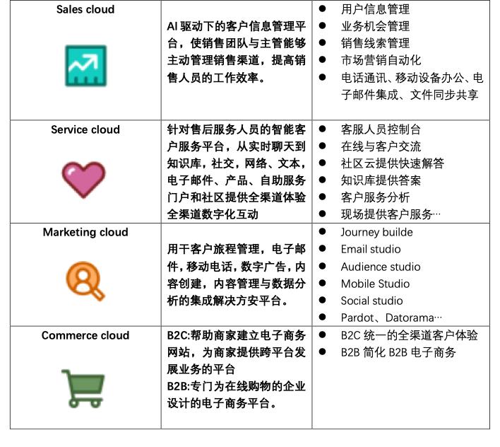 从现有的产品格局来看,历年财报中的营收大头是订阅与支持服务,其中包含的四朵云分别是:Sales Cloud(销售云)、Service Cloud、Marketing and Commerce Cloud(营销云和商务云)以及Salesforce Platform and Other(其他平台)。