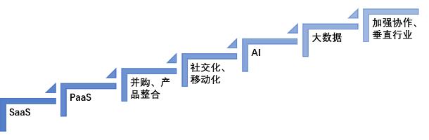 一直以来,Salesforce围绕CRM这一主体不断深化,如果将Salesforce的成长经历比喻成多级跳跃,那么从引入执行SaaS这个概念的时候,它就已经完成了第一级。回顾Salesforce20余年的历史,2010年之前主要是内生发展期,2011年后,Salesforce开启外延并购拓展,由并购及自然渗透双重叠加,让它的CAGR保持在20%-40%的增长,过渡到2015后,增长率保持在20%-30%之间,逐渐趋于成熟。
