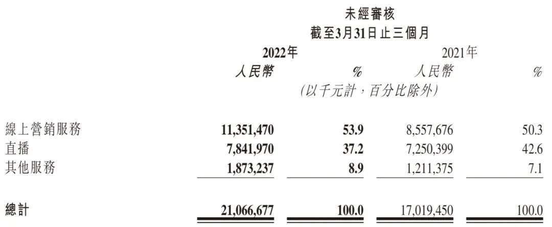 具体到各业务上,快手营收主要包括线上营销服务、直播与其他(主要为电商)三大业务板块。其中快手线上营销服务业务,在一季度实现收入114亿元,同比增长32.6%,对收入的贡献占比为53.9%。