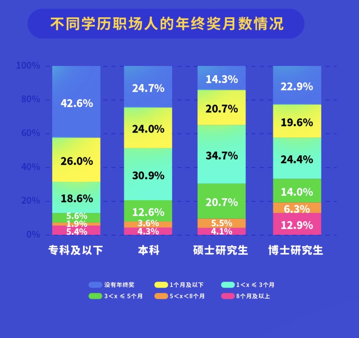 近20%的博士拿到了5个月以上的年终奖,42.6%的专科及以下人群没拿到年终奖。17.3%的博士年终奖增加50%以上,远高于其他学历人群。而有30.3%的专科及以下人群年终奖减少20%以上。