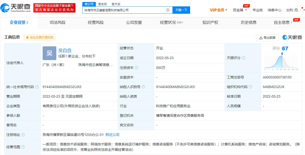 36氪广东获悉,天眼查App显示,近日,珠海市悦云美智信息科技有限公司成立,法定代表人吴自良,注册资本500万,经营范围包括网络技术服务;信息咨询服务;计算机系统服务;房地产咨询;咨询策划服务等。股东信息显示,该公司由美的置业集团有限公司全资持股。