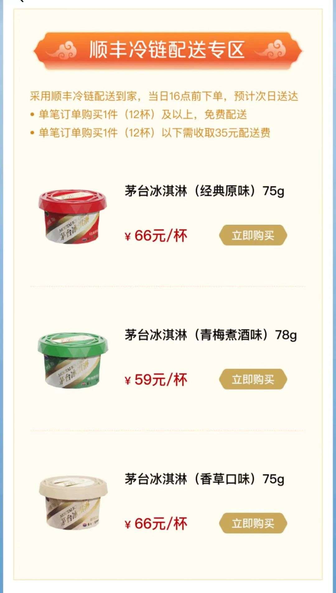 上新的三款口味在包装、价格等方面均与此前上市的产品不同。三款预包装口味分别为经典原味75g(66元/杯)、青梅煮酒味78g(59元/杯)、香草口味75g(66元/杯),三款口味均为茅台、蒙牛联名推出的全乳脂冰淇淋,三款产品茅台酒含量比例分别为2%、1.6%、2%。茅台官方曾表示,推出冰淇淋是公司向年轻消费群体靠近的首次突破。
