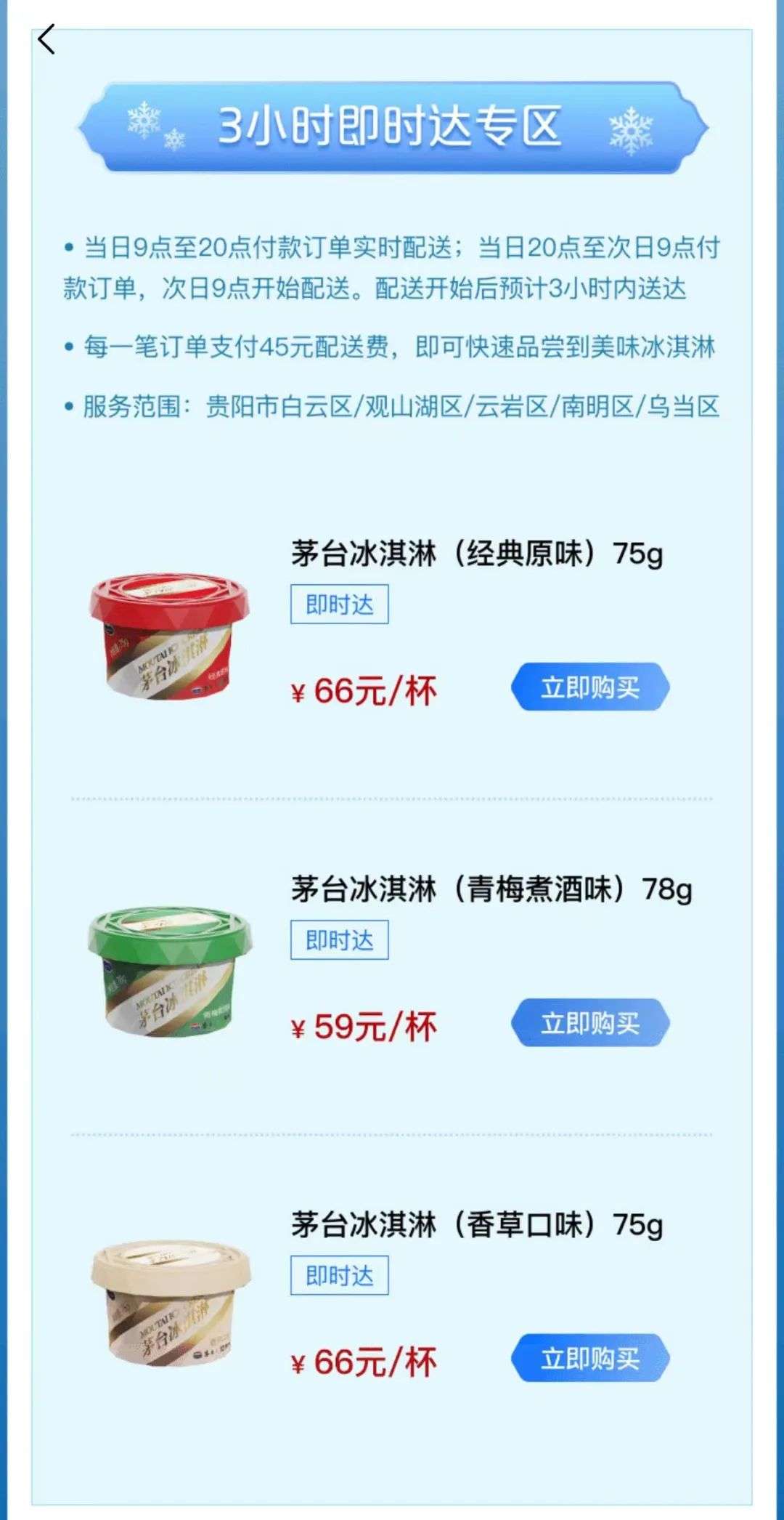 茅台官方声称,5月29日之后,消费者可以在“i茅台”上下单,到时开通了冷链配送,其他城市的消费者也有机会品尝到茅台冰淇淋。未来,茅台的经销商可以开加盟店。