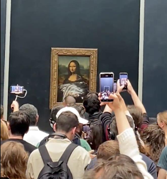 万幸,《蒙娜丽莎》画作本作由一层结实的玻璃保护着,奶油蛋糕并没有直接怼到画布上。不过现场游客倒是非常兴奋的样子,纷纷举起手机拍摄被奶油遮挡的《蒙娜丽莎》。