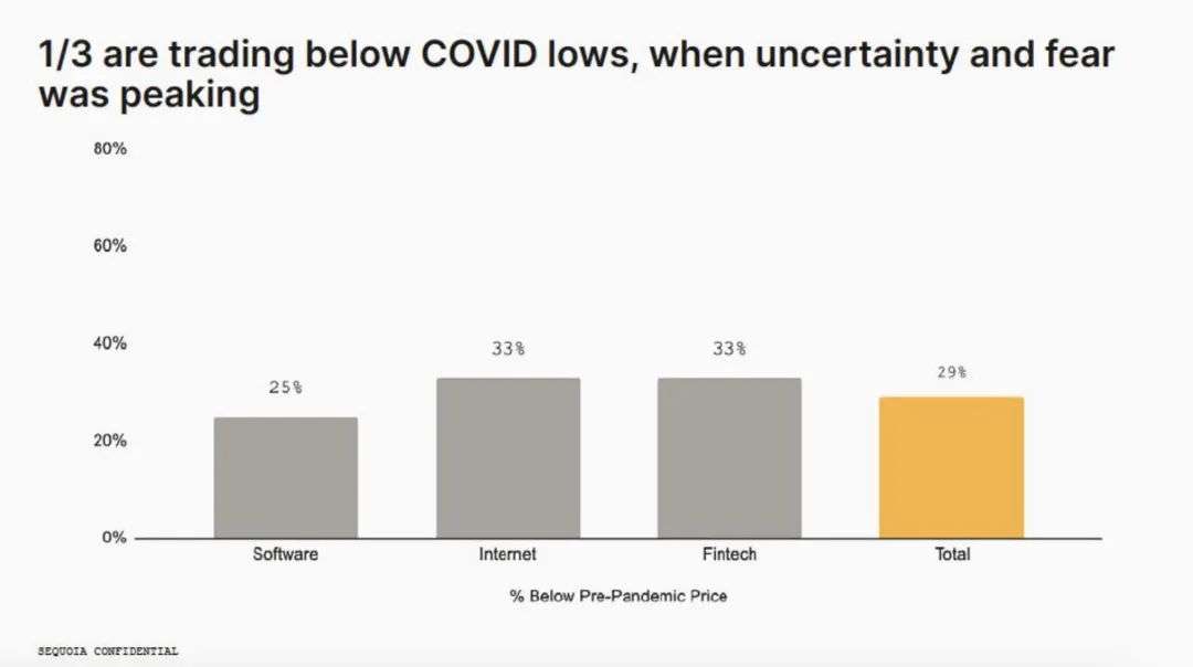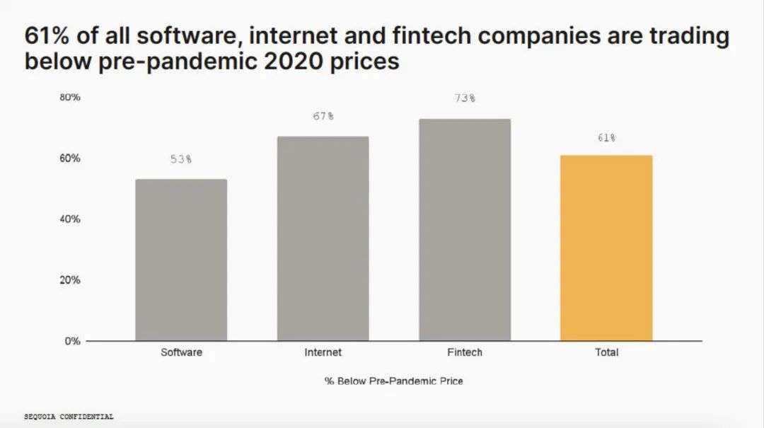 所有的软件、互联网和金融公司里,有 61% 的公司目前的市值低于 2020 年疫情前的价格。