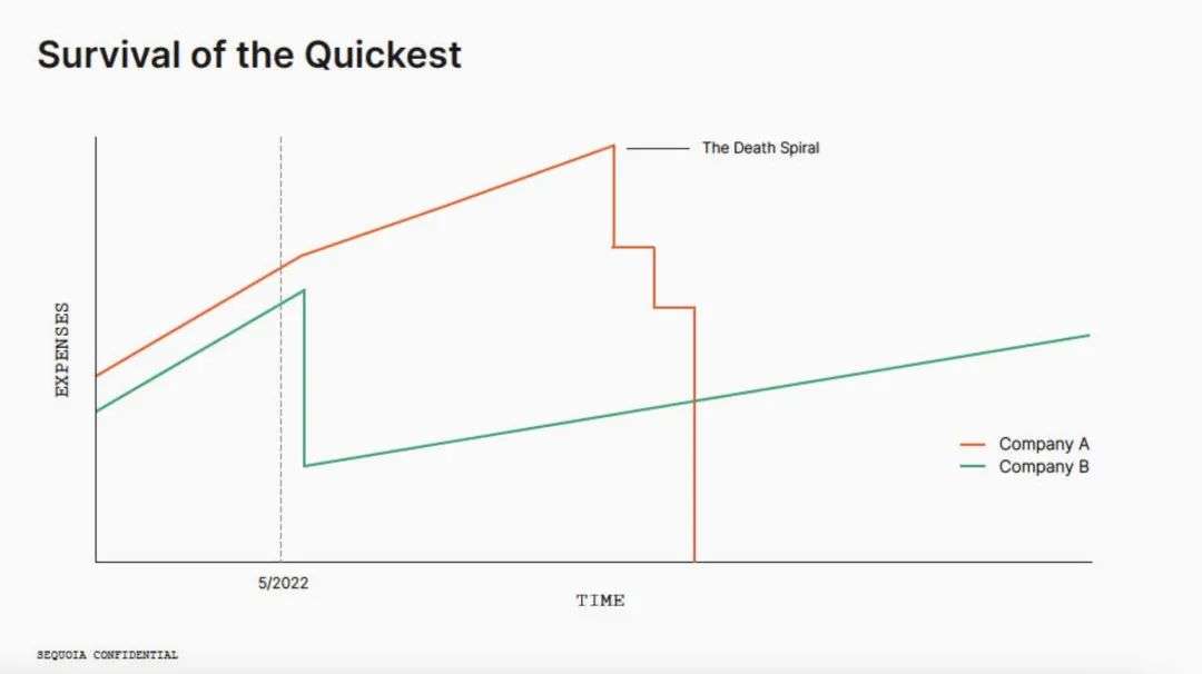 就像上图中的 A 和 B 两家公司,最快做出应对的 B 公司拥有更多的现金流,更可能避免死亡螺旋。