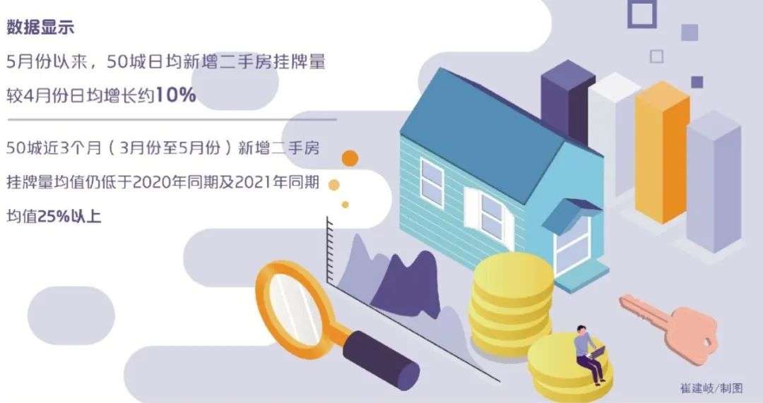 贝壳研究院数据显示,5月份以来,贝壳50城日均新增二手房挂牌量较4月份日均增长约10%。而放长周期看,尽管50城近3个月(2022年3月份至5月份)新增二手房挂牌量均值较今年1月份至2月份均值环比增长约四成,却均低于2020年同期以及2021年同期均值25%以上。