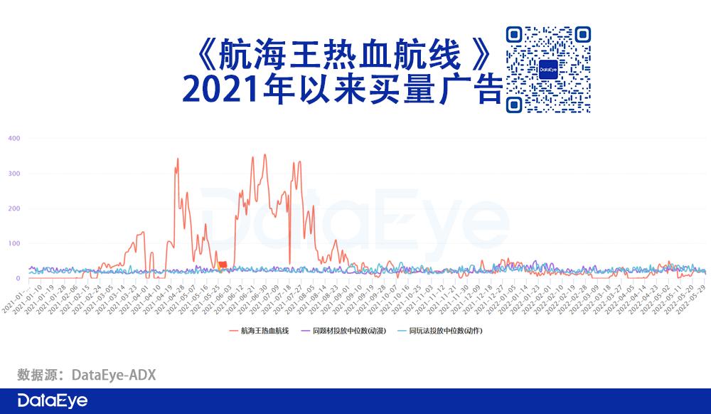 不仅投放量偏低,《航海王热血航线》整体投放时间也较短,21年9月(上线四个月后)起日均投放素材只有几十组,远低于同期其他游戏。