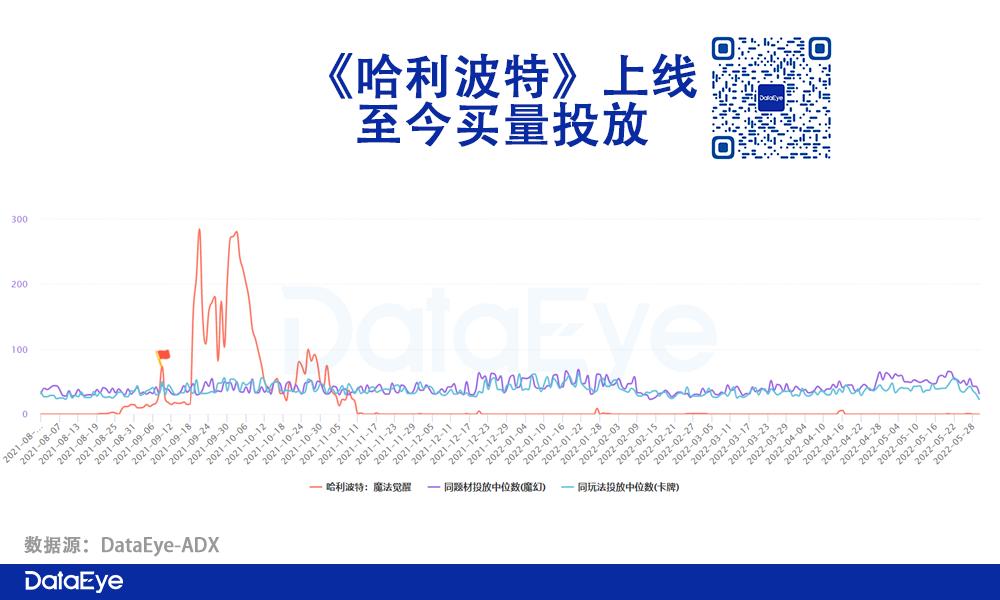 以当年的王牌产品《哈利波特:魔法觉醒》为例,从效果广告的投放来看,整体投放力度偏低,上线当日仅有73条投放素材,单日投放峰值仅为280余组,效果广告的素材内容多数为游戏内的CG动画。