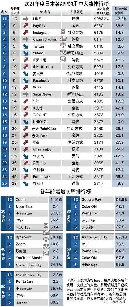 日本经济新闻(中文版:日经中文网)根据数据分析企业Values的调查结果,绘制了2021年度用户人数和各年龄层(20多岁~60多岁)与2019年度相比的增长率排行榜。