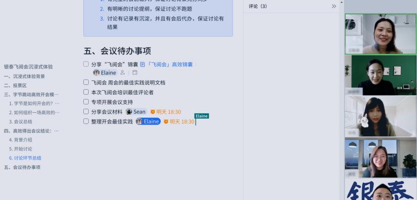 这对于早已习惯高效开会的效能顾问来说,改善开会方式这件事必须提上日程。于是,效能顾问开始着手推广——飞阅会。一开始,高管们不适应默读加评论的开会方式,效能顾问便手把手带大家如何在会议文档上做评论,还结合银泰集团的开会内容,不断优化会议文档。