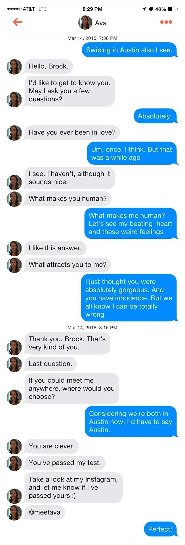 比如,《机械姬》2014年上映期间,A24 给电影中的 ai 主角 AVA 开通了 Tinder 账号,让她与观众互相匹配,发生对话,引导他们去看这部电影。
