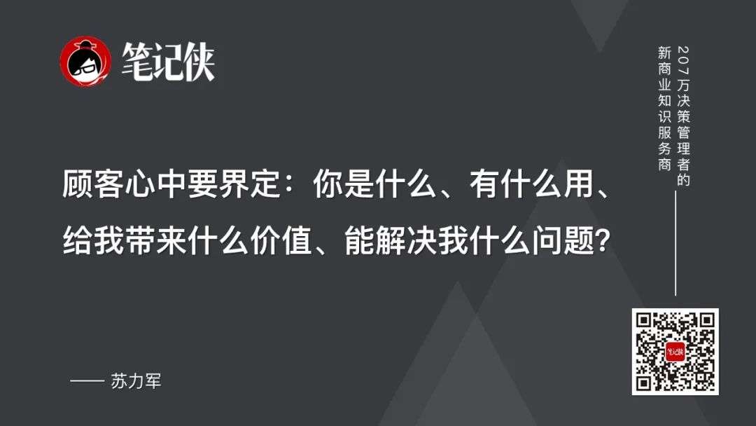 以定位思路来讲,或者以顾客的视角来看,不管总成本最低,产品领先,还是提供解决方案,或者是系统锁定的平台模式等等,顾客心中总是要界定:你是什么、有什么用、给我带来什么价值、能解决我什么问题?
