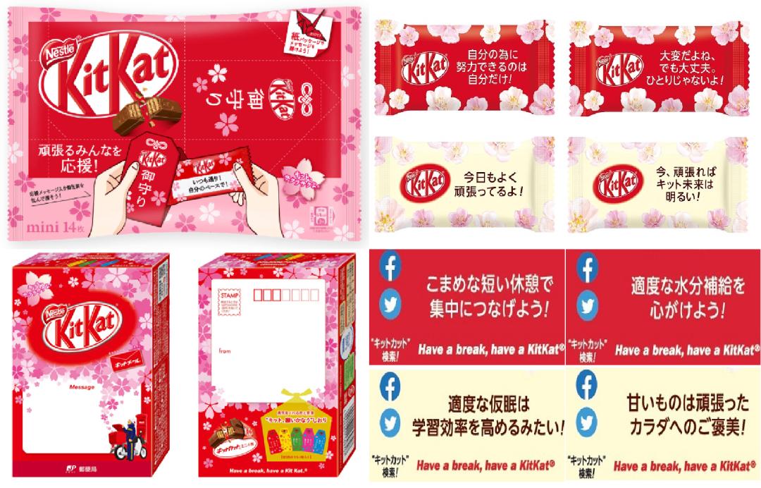 时间回到今年,刚过去的日本高考季,KitKat又推出了吉祥的红白包装,使得考生可同时享用牛奶巧克力和白巧克力两种口味。除此之外,每个独立包装正面都印刷有鼓励考生的语句,背面则印有应试学习相关的小贴士。