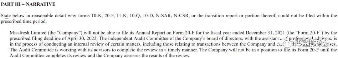 今年4月29日,每日优鲜公告显示,无法在最终截止日2022年4月30日之前提交2021年年报。同时公告中还称,“董事会的独立审计委员会在专业顾问的协助下,正在对某些事项进行内部审查,包括公司与某些第三方企业之间的交易事项。在审计委员会完成审查且公司评估调查结果之前,公司将无法提交20-F表格”。