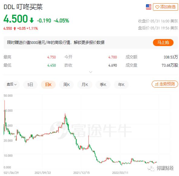 叮咚买菜的股价走势与每日优鲜类似,上市之后便迎来大跌,但不同的是,截至5月31日叮咚买菜股价仍报收4.5美元/股,是每日优鲜的28倍之多。