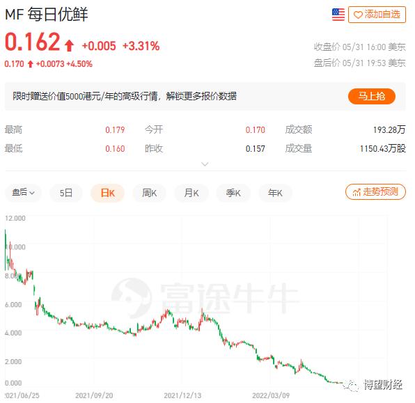 纵观每日优鲜整个资本市场表现,2021年6月25日发行价13美元/股,当日开盘破发,报收9.66美元/股,市值“蒸发”8亿美元,此后便开启暴跌模式,截至今年5月31日报收0.16美元/股,较最高价11美元/股已跌去近99%,市值也从首日的25.85亿美元缩水至0.4亿美元。